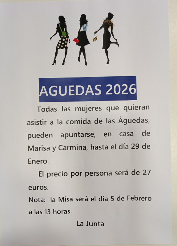 Todas las mujeres que deseen asistir podrán apuntarse hasta el día 29 de enero en casa de Marisa y Carmina. El precio por persona será de 27 euros.